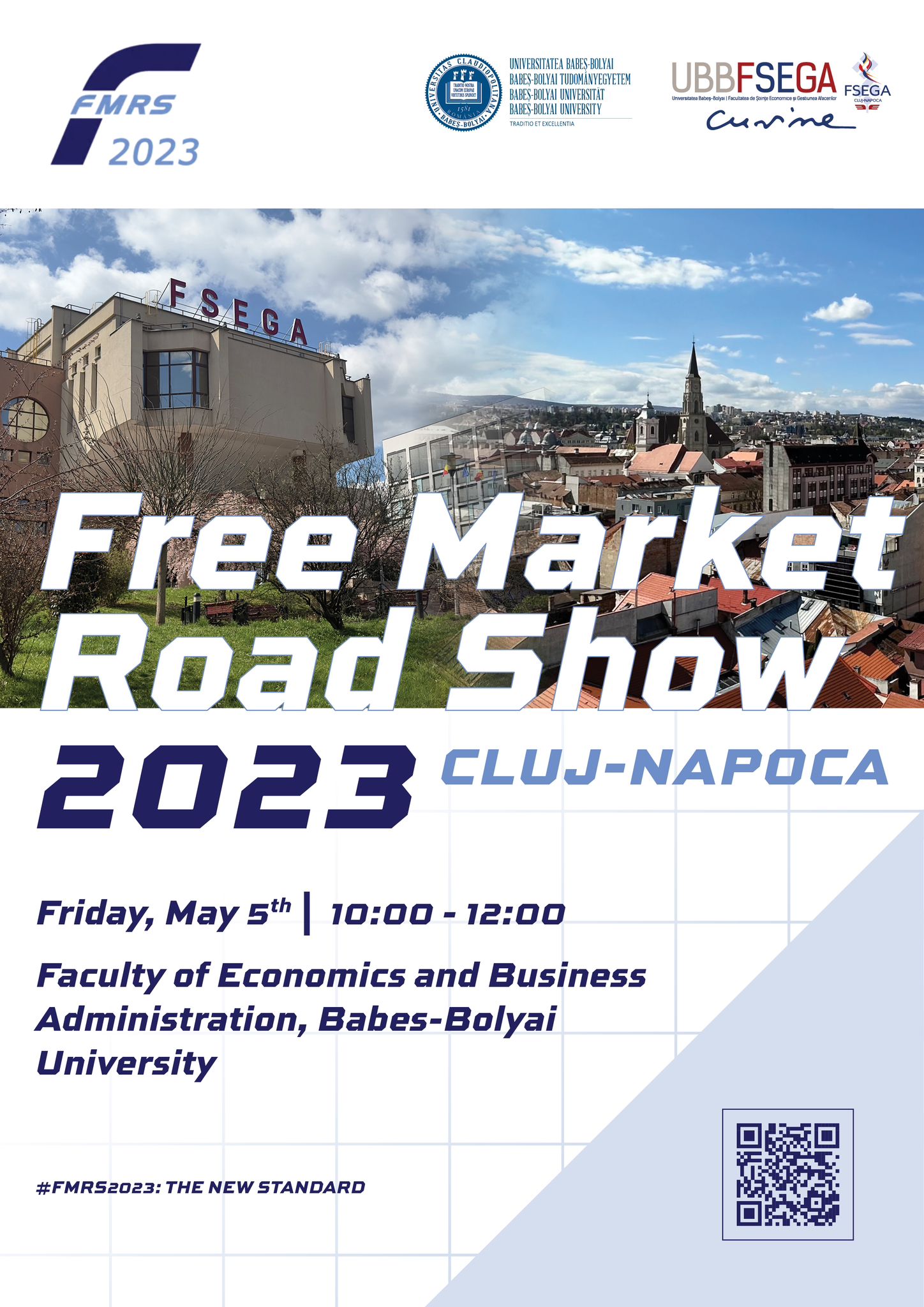 The Free Market Road Show (FMRS), în colaborare cu FSEGA, organizează în data de 5 mai 2023, între orele 10:00 - 12:00, în campusul FSEGA, o conferință pe teme economice de actualitate, avându-i ca vorbitori pe Barbara Kolm, Dan Mitchell, Cris Lingle, Per Bylund și Michael Williams.