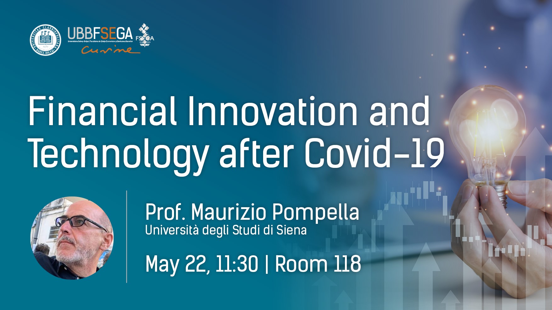 Luni, 22 mai 2023, între 11:30 - 13:00, în sala 118, prof. dr. Maurizio Pompella de la Universitatea din Siena va susține o prelegere cu titlul Financial Innovation and Technology after Covid-19.