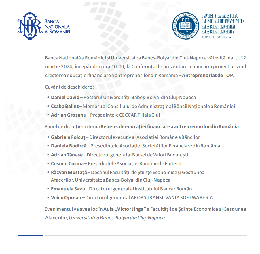 Banca Națională a României și UBB vă invită marți, 12 martie 2024, începând cu ora 10:00, la conferinț de prezentare a proiectului privind creșterea educației financiare a antreprenorilor din România - Antreprenoriat de Top.