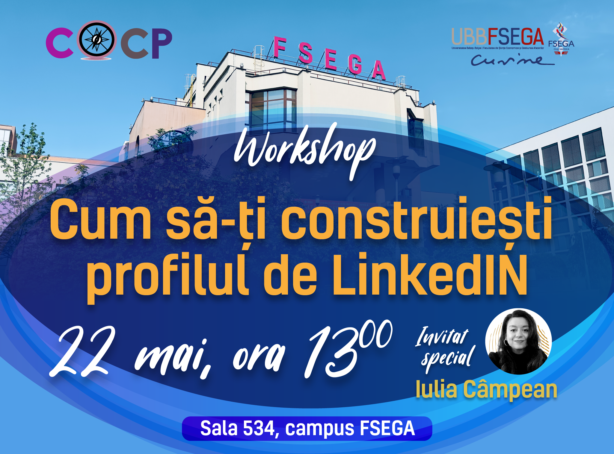 În data de 22 mai 2024, începând cu ora 13, va avea loc workshopul intitulat "Cum să-ți construiești profilul de LinkedIn?" adresat studenților FSEGA și organizat de către Centrul de Orientare şi Consiliere Profesională (COCP) al FSEGA.