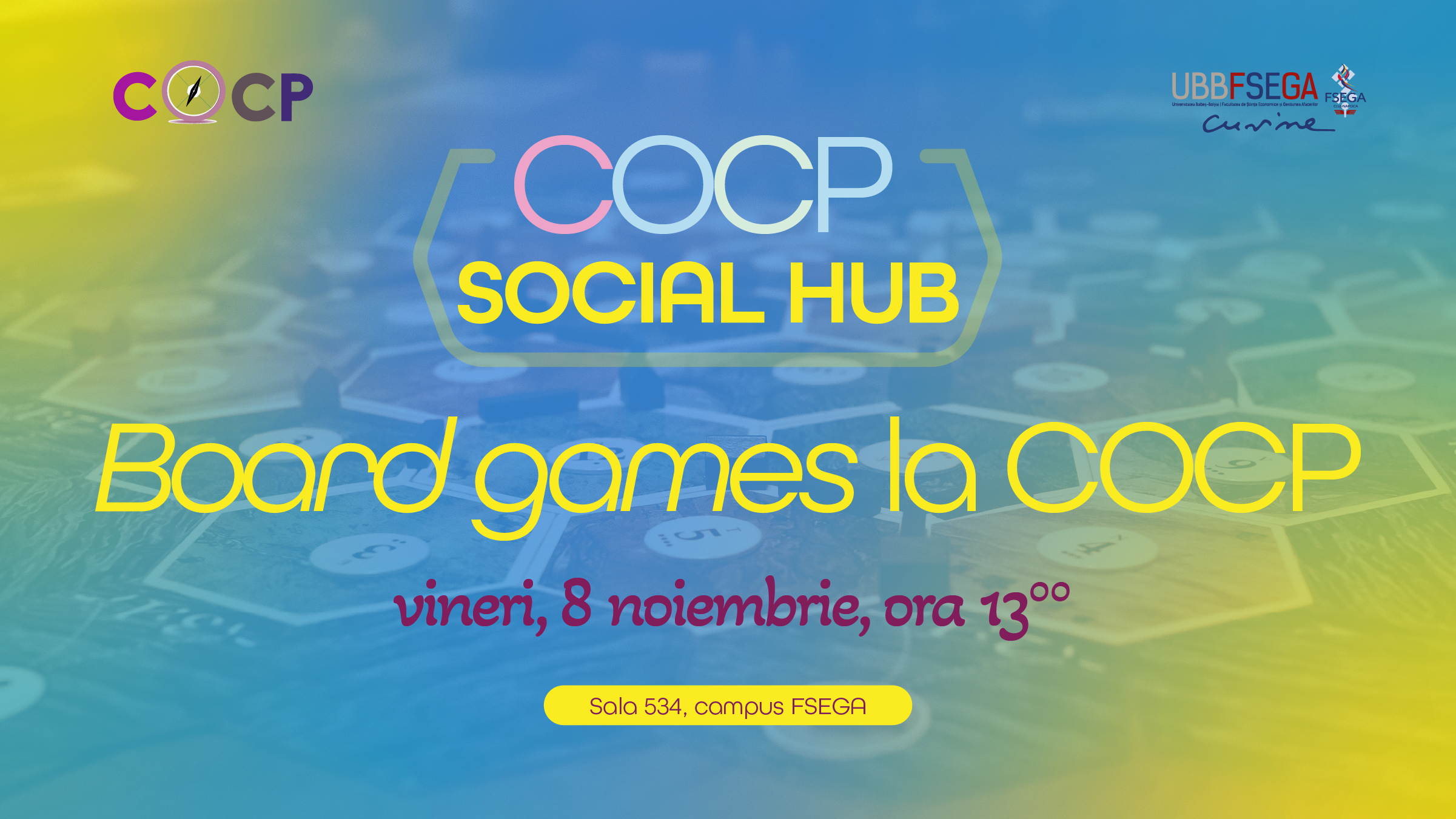 Centrul de Orientare și Consiliere Profesională din cadrul FSEGA invită studenții facultății la un nou eveniment marca COCP Social Hub, și anume Board games la COCP care va avea loc vineri (8 noiembrie) de la ora 13:00.