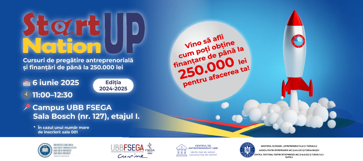Centrul de Antreprenoriat al Universității Babeș-Bolyai (UBB), prin Facultatea de Științe Economice și Gestiunea Afacerilor, în colaborare cu Centrul Teritorial AIMM Cluj din cadrul Ministerului Economiei, Digitalizării, Antreprenoriatului și Turismului organizează, în data de 6 iunie 2025 de la ora 11:00, un eveniment de prezentare a Programului Start-Up Nation – România, ediția 2024-2025, program cofinanțat prin Fondul Social European Plus, în cadrul Planului Educațional Operațional 2021–2027.