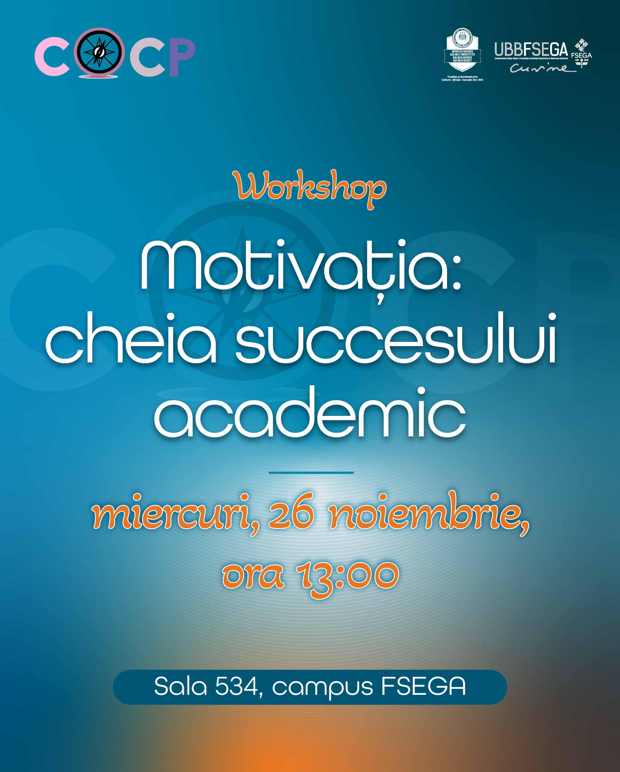 În data de26 noiembrie 2025, începând cu ora 13, va avea loc workshopul Motivația: cheia succesului academic, adresat studenților FSEGA, organizat de către Centrul de Orientare și Consiliere Profesională (COCP) al FSEGA.