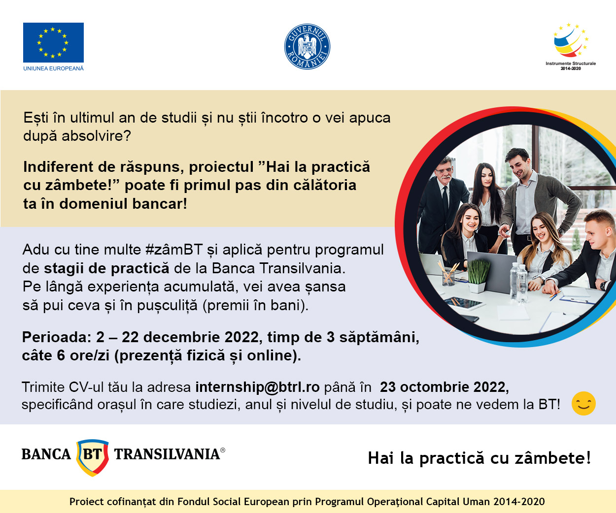 Stagiu de internship plătit la Banca Transilvania în orașul tău. Termen de aplicare: 23 octombrie 2022!