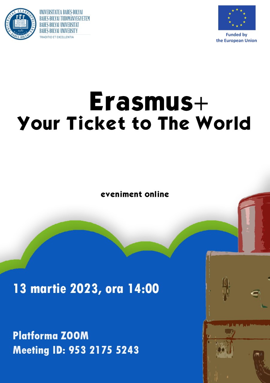 Biroul Erasmus+ al UBB va organiza in data de 13 martie 2023 la ora 14:00, evenimentul on-line intitulat Erasmus + Your Ticket to the World, destinat tuturor studenților UBB interesați de o mobilitate Erasmus+ în acest an academic.