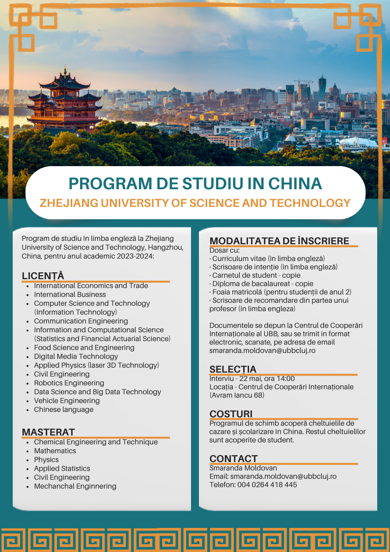 Studenții UBB au posibilitatea să studieze în China, Hanghzou, la Zhejiang University of Science and Technology (ZUST), în anul universitar 2023-2024, la diverse specializări, inclusiv din domeniul științelor economice, în limba engleză.