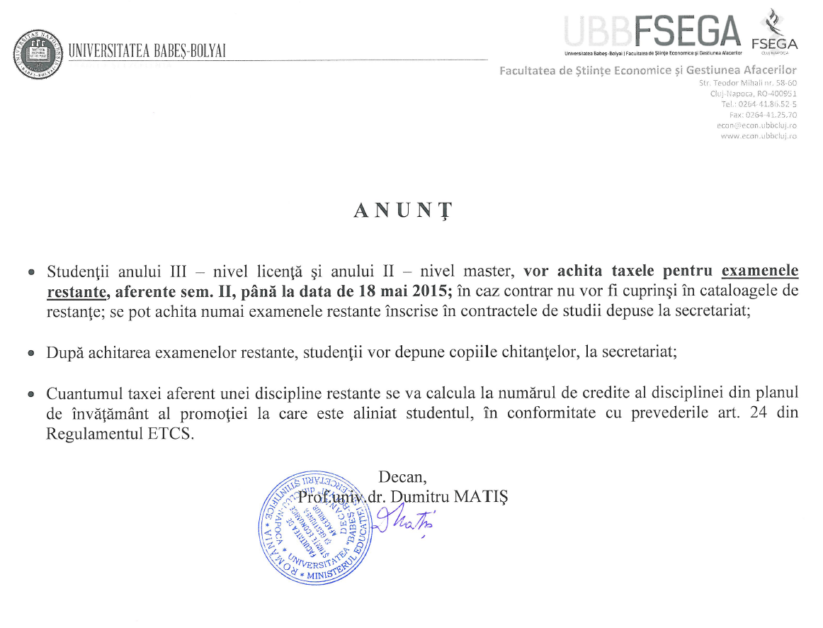 Anunt privind achitarea taxelor pentru examenele restante, sem. II