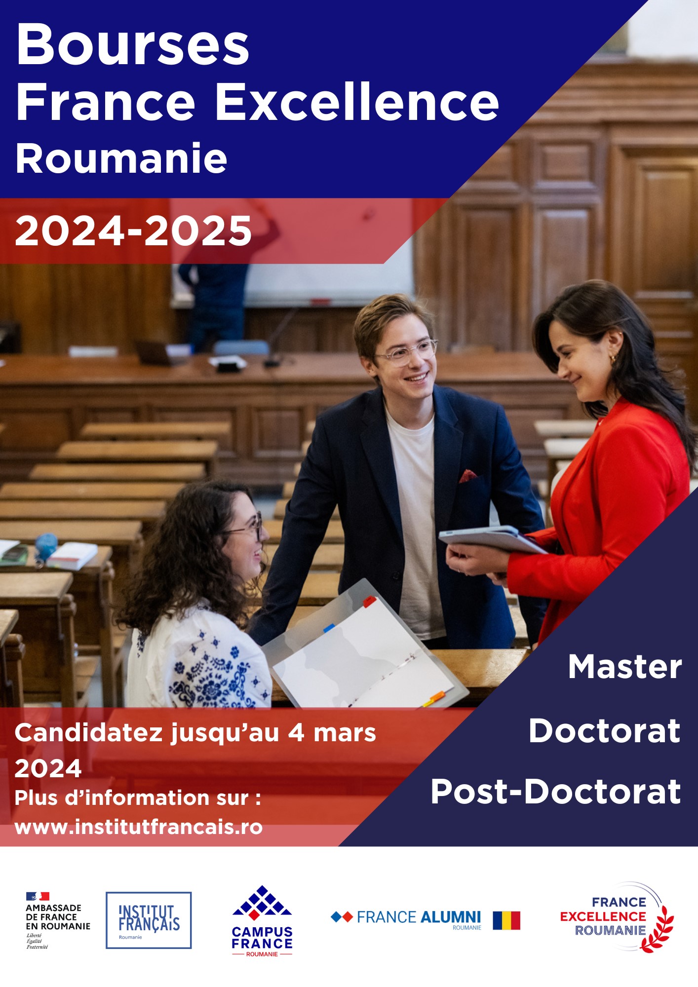 În fiecare an, în perioada decembrie-martie, Ambasada Franței și Institutul Francez din România lansează un apel național pentru bursele France Excellence România pentru Masterat, Doctorat și Post-Doctorat, destinată studenților români care doresc să își continue studiile în Franța.
