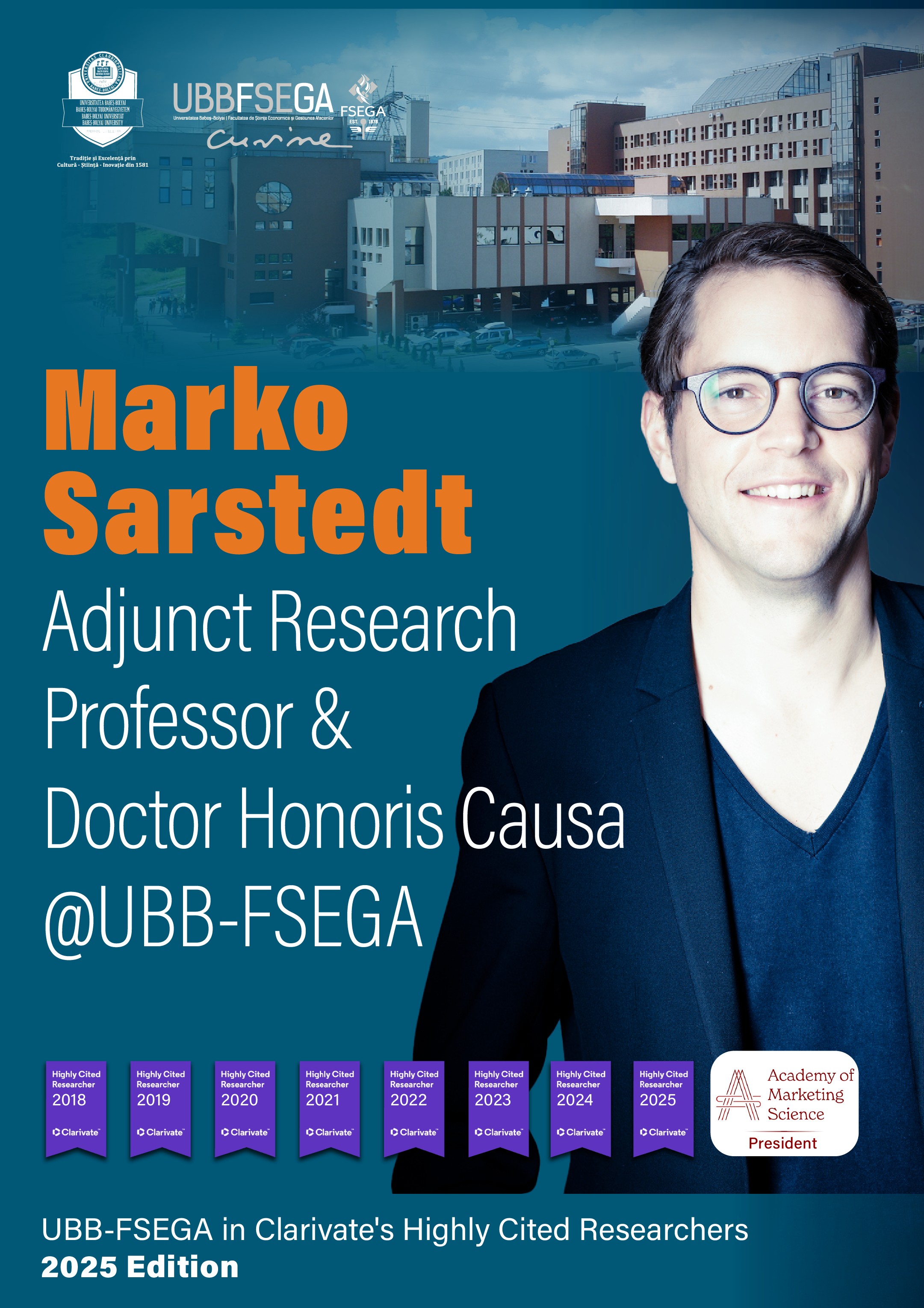 Marko Sarstedt, profesor la Ludwig-Maximilians-Universität München, cercetător colaborator și Doctor Honoris Causa la UBB-FSEGA și președinte al Academy of Marketing Science, se regăsește pentru al optulea an consecutiv în prestigioasa listă Highly Cited Researchers, elaborată de Clarivate, pe baza datelor indexate în Web of Science.
