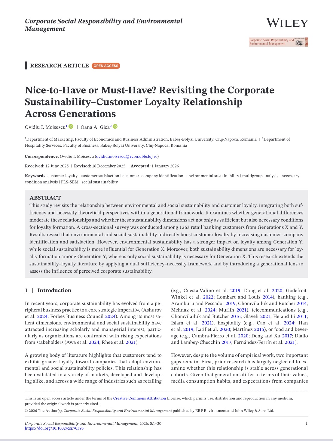 Moisescu, O.I. & Gică, O.A. (In press) Nice-to-Have or Must-Have? Revisiting the Corporate Sustainability–Customer Loyalty Relationship Across Generations. Corporate Social Responsibility and Environmental Management
