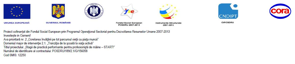 Proiectul “Stagii de practică performante pentru profesioniştii de mâine – START!”, cod proiect POSDRU/189/2.1/G/156059, cofinanţat din Fondul Social European, prin Programul Operaţional Sectorial Dezvoltarea Resurselor Umane 2007 – 2013 – „Investeşte în oameni!”, Axa prioritară 2” „Corelarea învăţării pe tot parcursul vieţii cu piaţa muncii”, Domeniul Major de Intervenţie 2.1 „ Tranziţia de la şcoală la viaţa activă ”, se derulează pe o perioadă de 6 luni (iulie – decembrie 2015).
