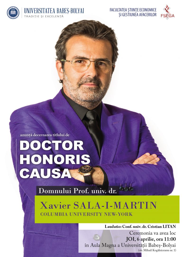 Unul dintre cei mai importanți economiști ai momentului, Xavier Sala-i-Martin, profesor la Columbia University, va fi distins joi, 6 aprilie 2017, cu titlul Doctor Honoris Causa al Universității Babeș-Bolyai.