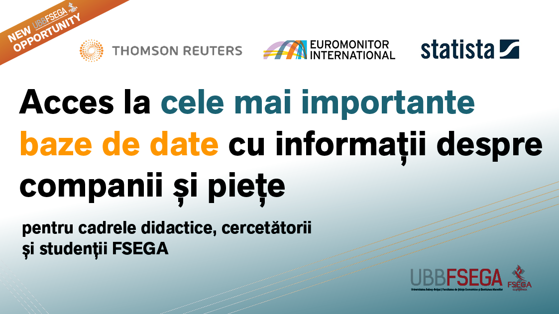 FSEGA provides all its teachers, researchers and students with access to the most important databases comprising information on companies and markets: Thomson Reuters Eikon, Euromonitor International Passport and Statista. The access represents a first for a Romanian faculty and provides the informational infrastructure needed to increase the quality of scientific research and educational processes within FSEGA.