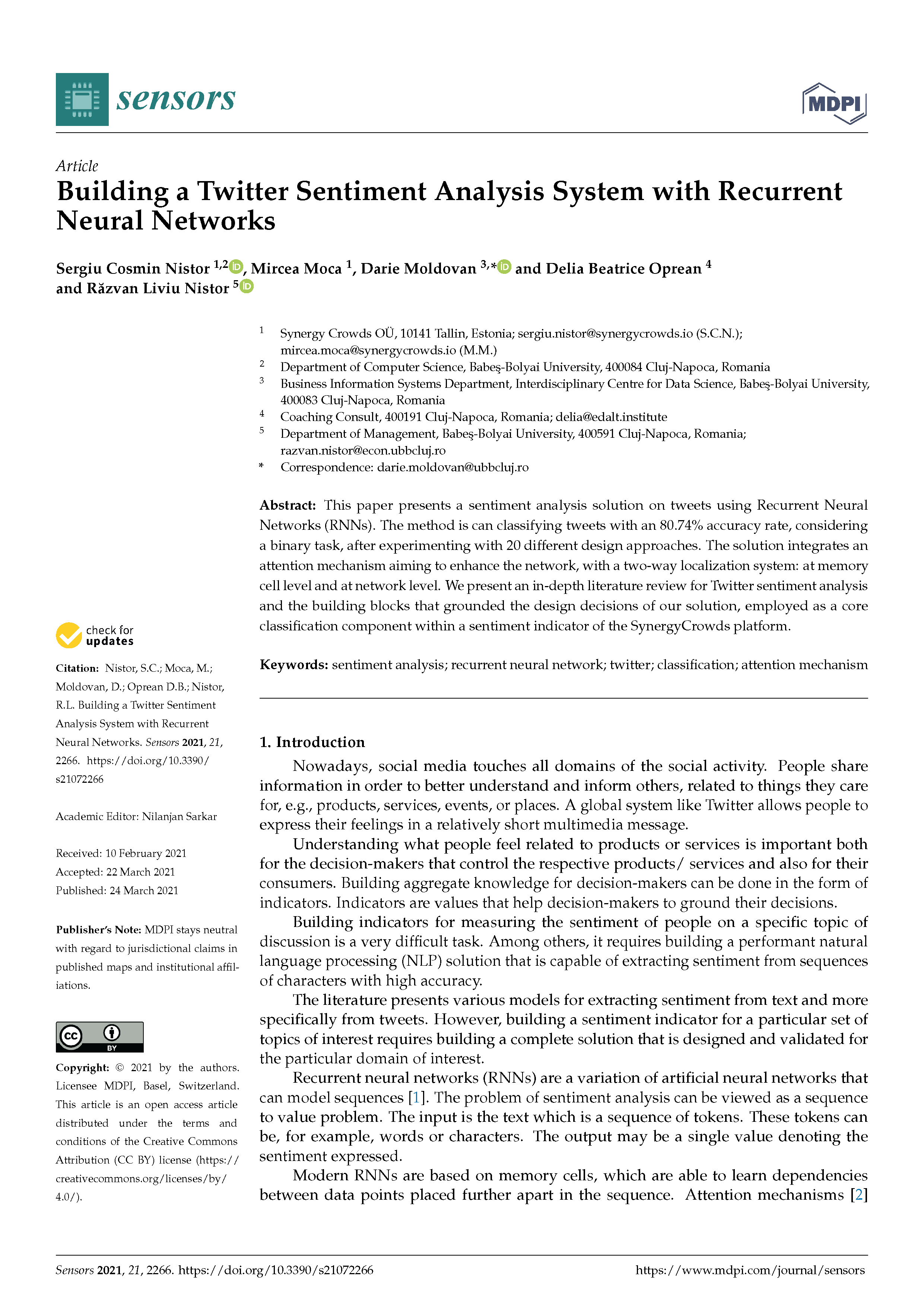 Nistor, S.C., Moca, M., Moldovan, D., Oprean, D.B. & Nistor, R.L. (2021) Building a Twitter Sentiment Analysis System with Recurrent Neural Networks. Sensors, 21(7), 2266.