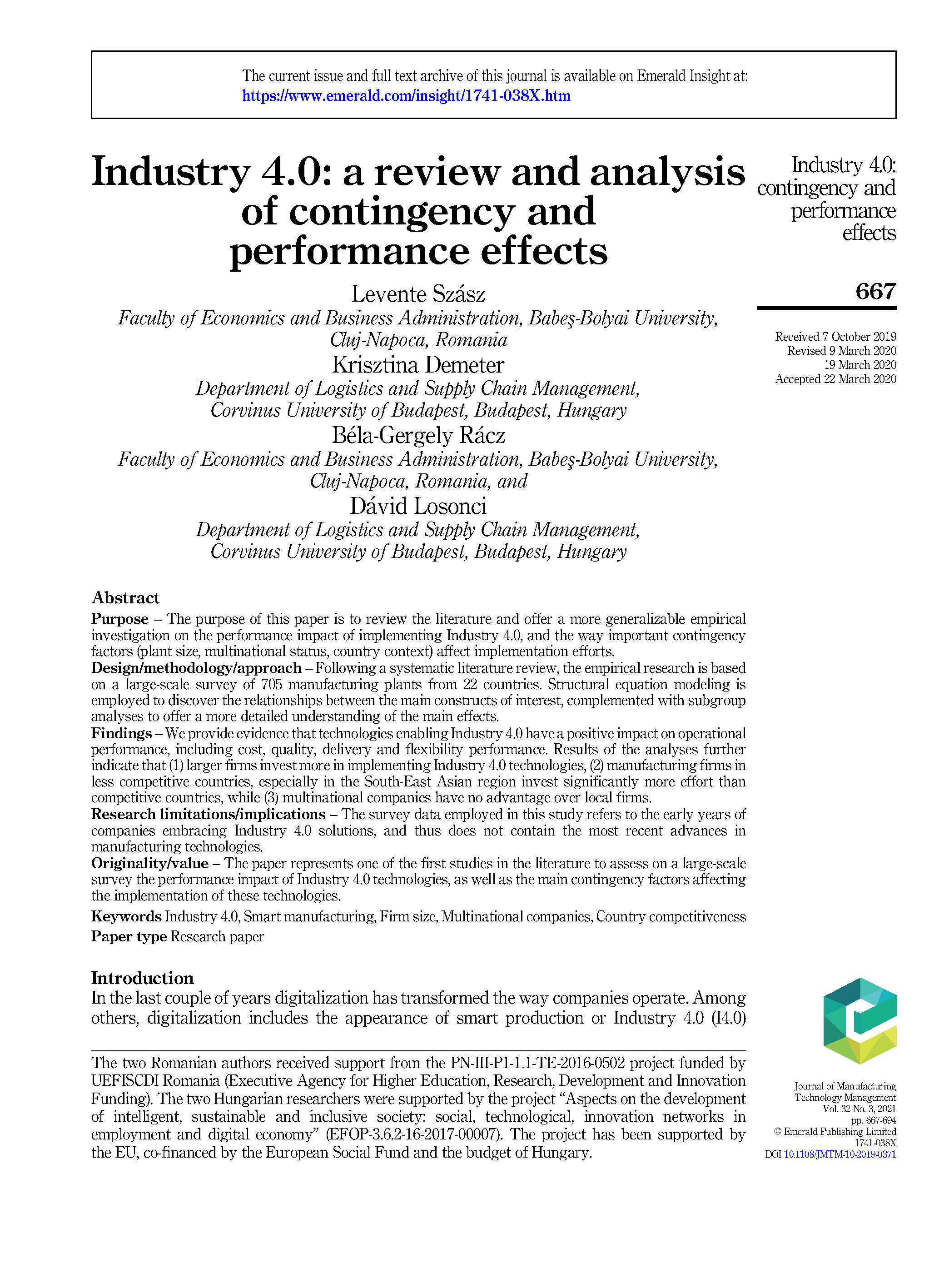 Szász, L., Demeter, K., Rácz, B.G. & Losonci, D. (2021) Industry 4.0: a review and analysis of contingency and performance effects. Journal of Manufacturing Technology Management, 32(3), 667-694.