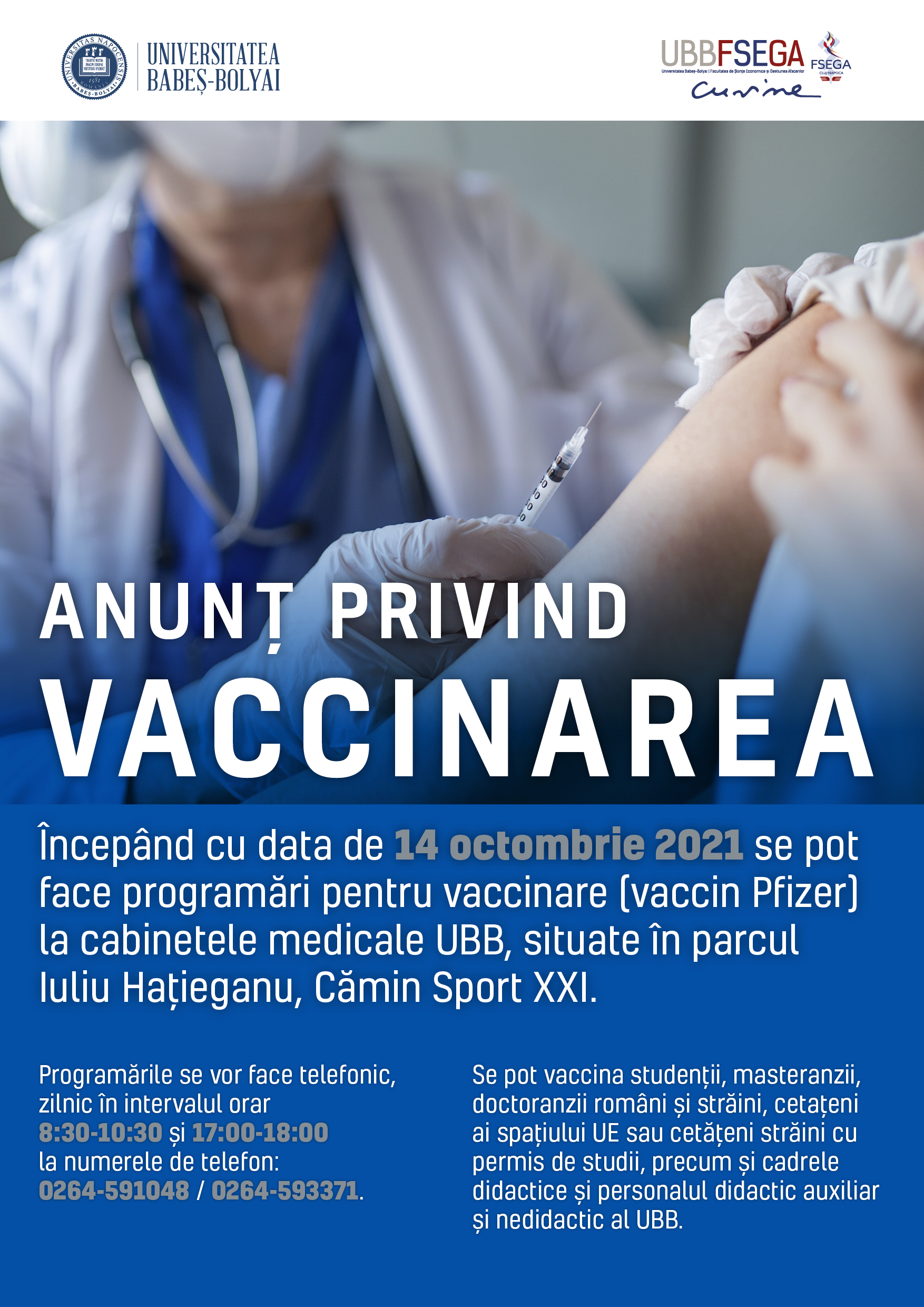 Începând cu data de 14 octombrie 2021 se pot face programări pentru vaccinare (vaccin Pfizer) la cabinetele medicale UBB, situate în parcul Iuliu Hațieganu, Cămin Sport XXI.
