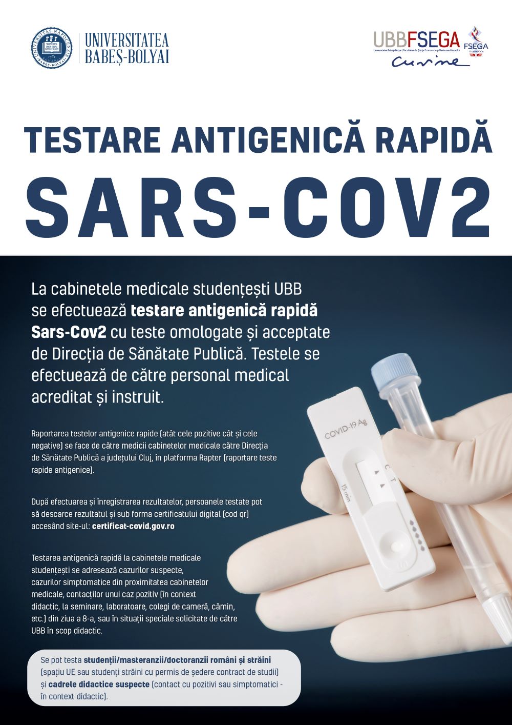 Studenții, masteranzii, doctoranzii și cadrele didactice suspecte (contact cu pozitivi sau simptomatici - în context didactic), se pot testa gratuit la cabinetele medicale studențești UBB, cu teste antigen rapide omologate și acceptate de Direcția de Sănătate Publică.