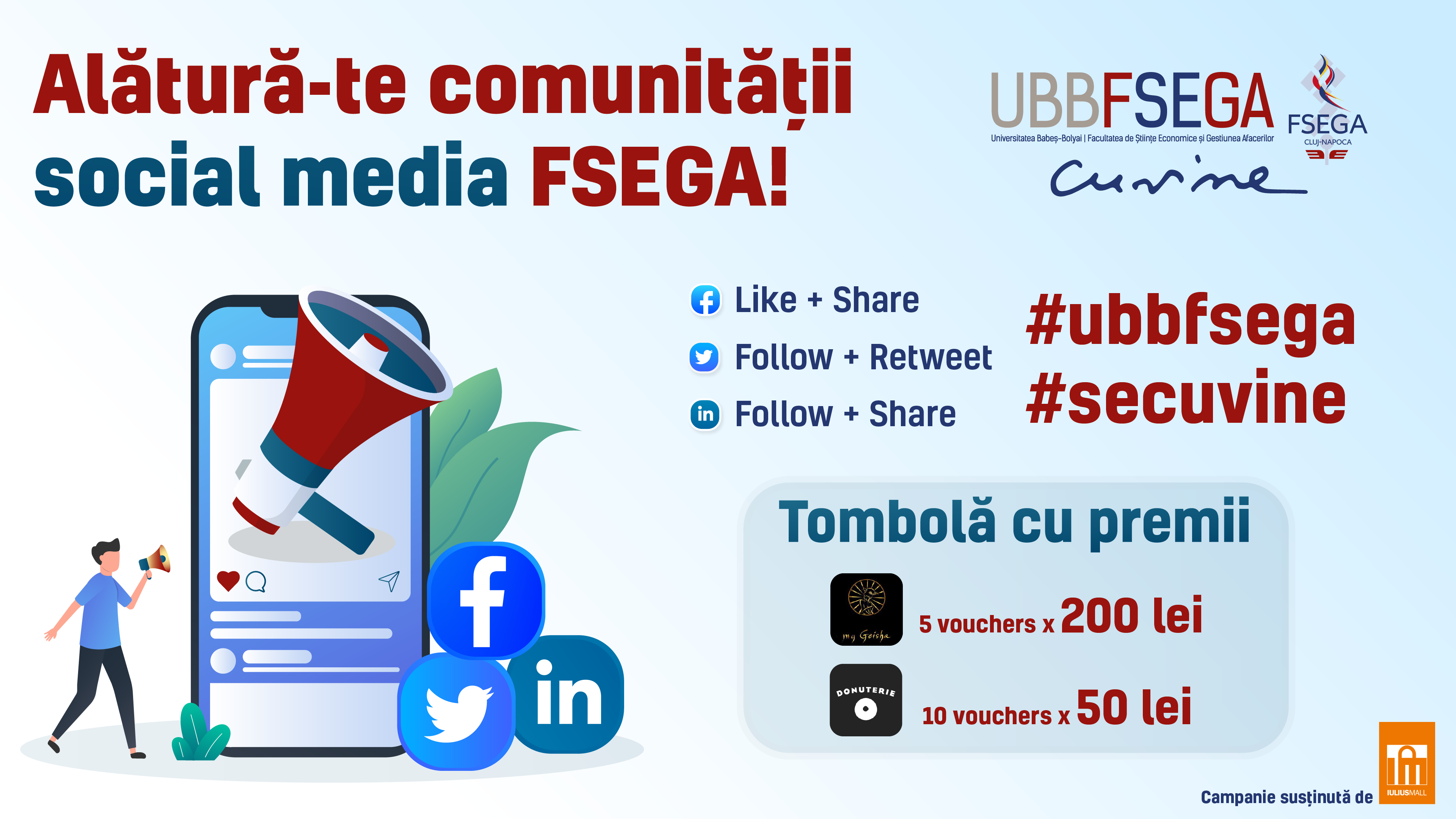În vederea creșterii vizibilității canalelor de social media ale facultății în rândul studenților, va fi organizată o tombolă cu premii la care vor putea participa toți studenții înmatriculați la programele de studii ale FSEGA care îndeplinesc cumulativ următoarele condiții: