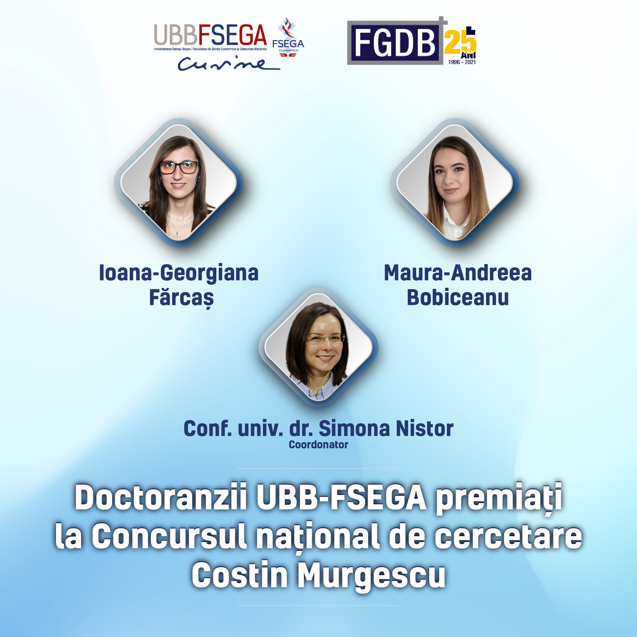 Doctoranzii UBB-FSEGA au fost premiați în cadrul concursului național de cercetare Costin Murgescu organizat de către Fondul de Garantare a Depozitelor Bancare (FGDB), organizat în luna decembrie a anului 2021.