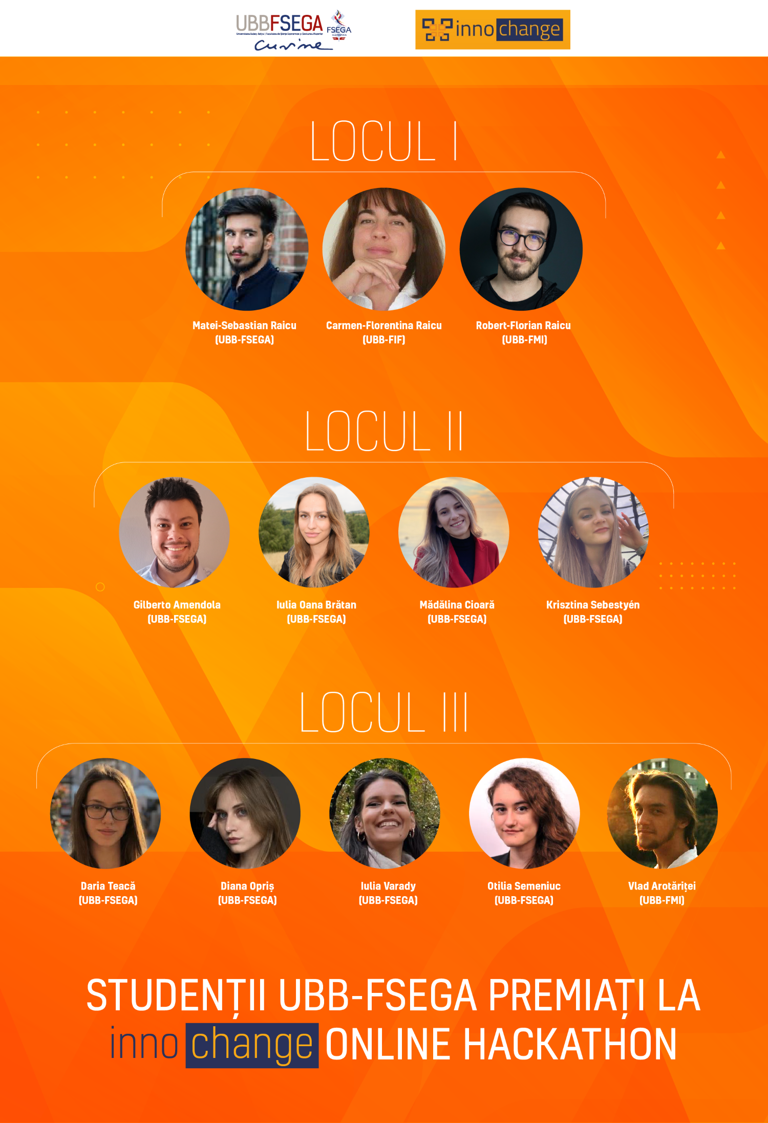 În cadrul competiției Innochange Online Hackathon, desfășurată în 3-4 decembrie 2021, studenții UBB-FSEGA au reușit performanța remarcabilă de a se clasa pe primele două locuri ale podiumului de premiere.