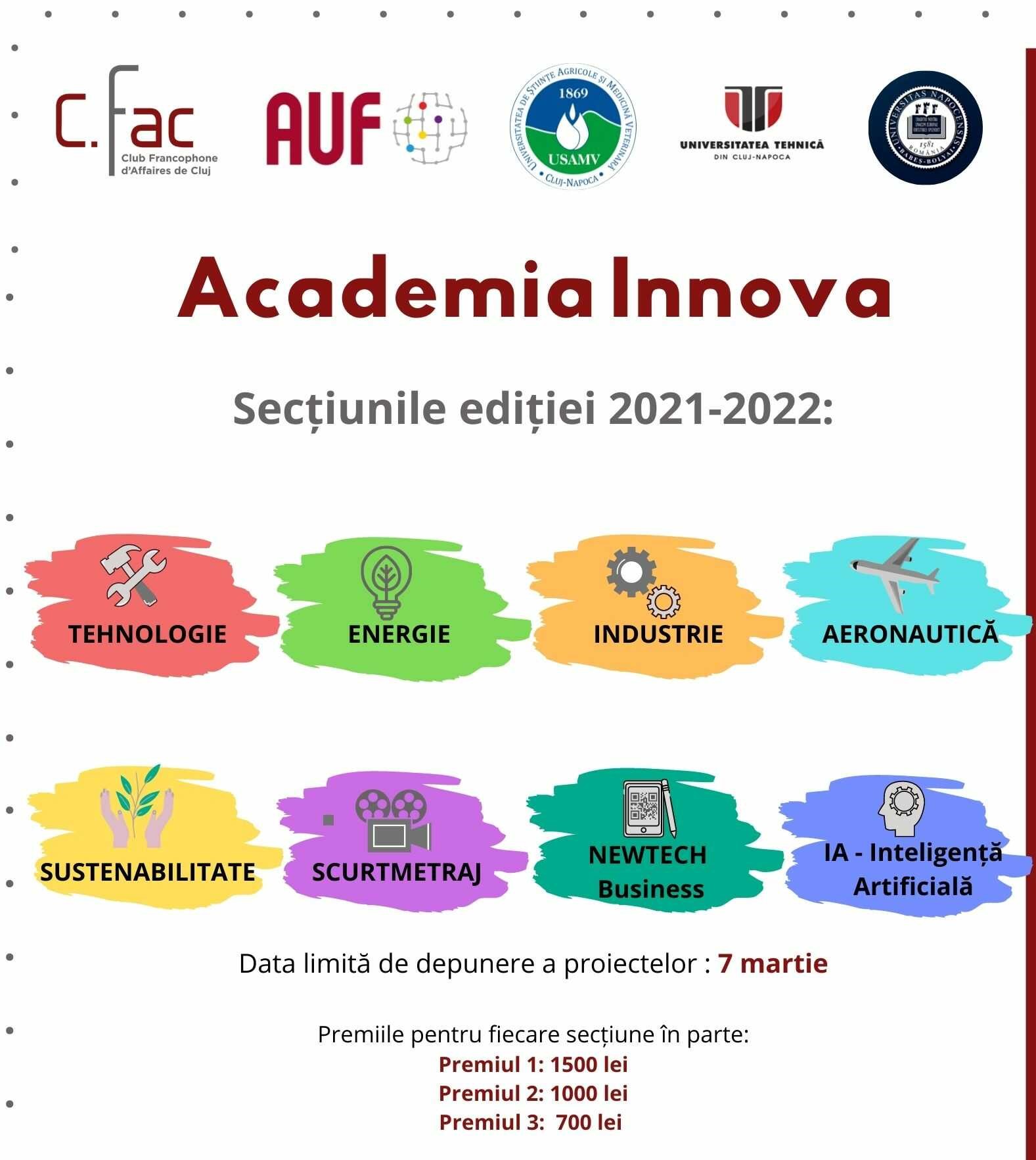 Clubul Francofon de Afaceri din Cluj împreună cu Agence Universitaire de la Francophonie (AUF), Universitatea Babeş-Bolyai, USAMV Cluj-Napoca și Universitatea Tehnică din Cluj-Napoca lansează un apel la proiecte în cadrul concursului Academia Innova pentru studenți.
