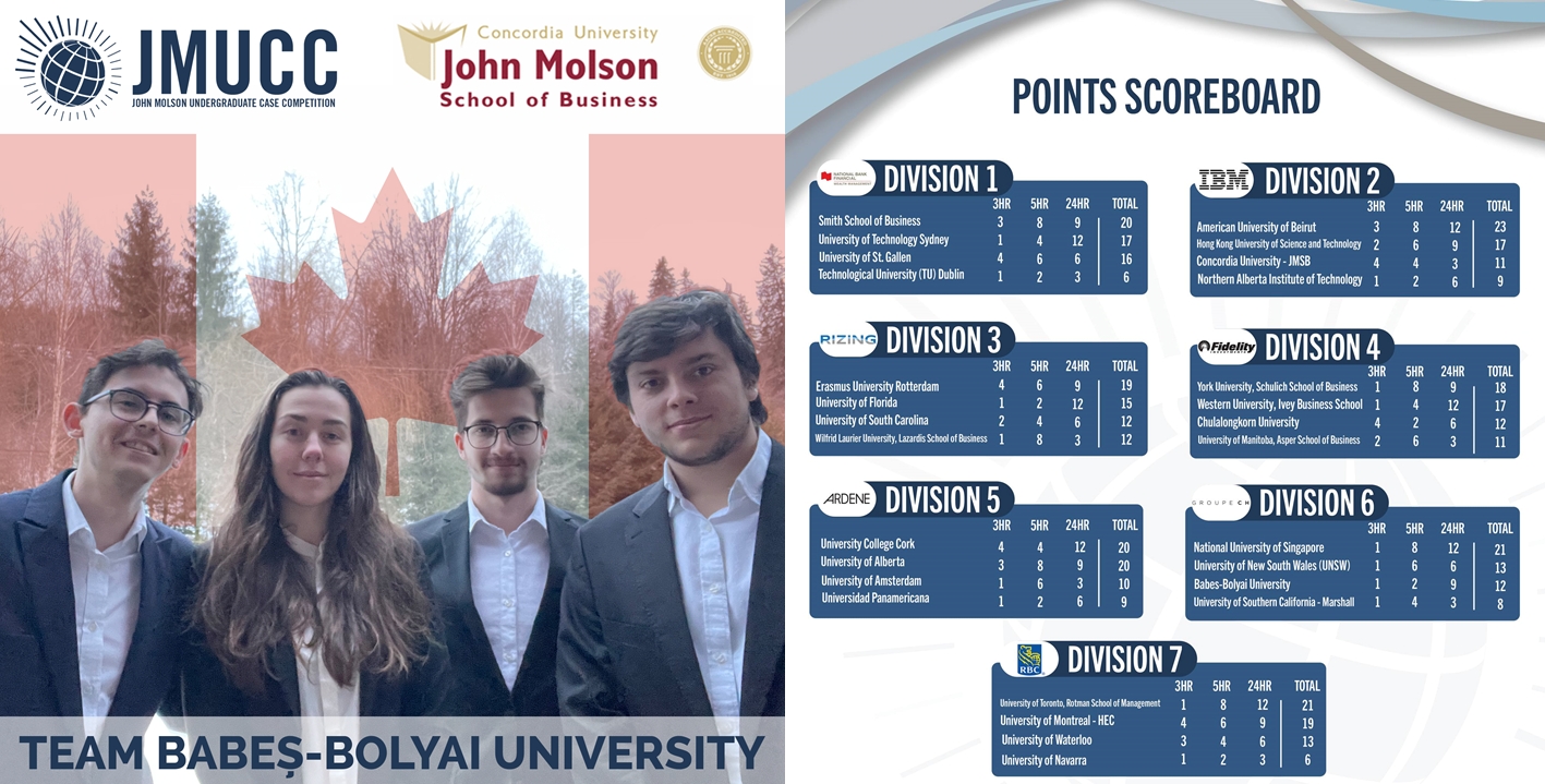 Studenții reprezentând Facultatea de Științe Economice și Gestiunea Afacerilor (FSEGA) din cadrul Universității Babeș-Bolyai (UBB) din Cluj-Napoca au reușit să se claseze pe locul 2 al grupei în cadrul celei mai dificile probe de 24 de ore în cadrul competiției internaționale de studii de caz organizată de John Molson School of Business din Montreal, Canada. La competiția organizată în perioada 27 februarie – 5 martie 2022 echipa clujeană a concurat în aceeași grupă cu echipe din Australia, SUA, respectiv o universitate din Singapore care a câștigat la final trofeul competiției. Datorită performanței excepționale din runda de 24 de ore, studenții clujeni au reușit să se claseze în final pe locul 3 al grupei.