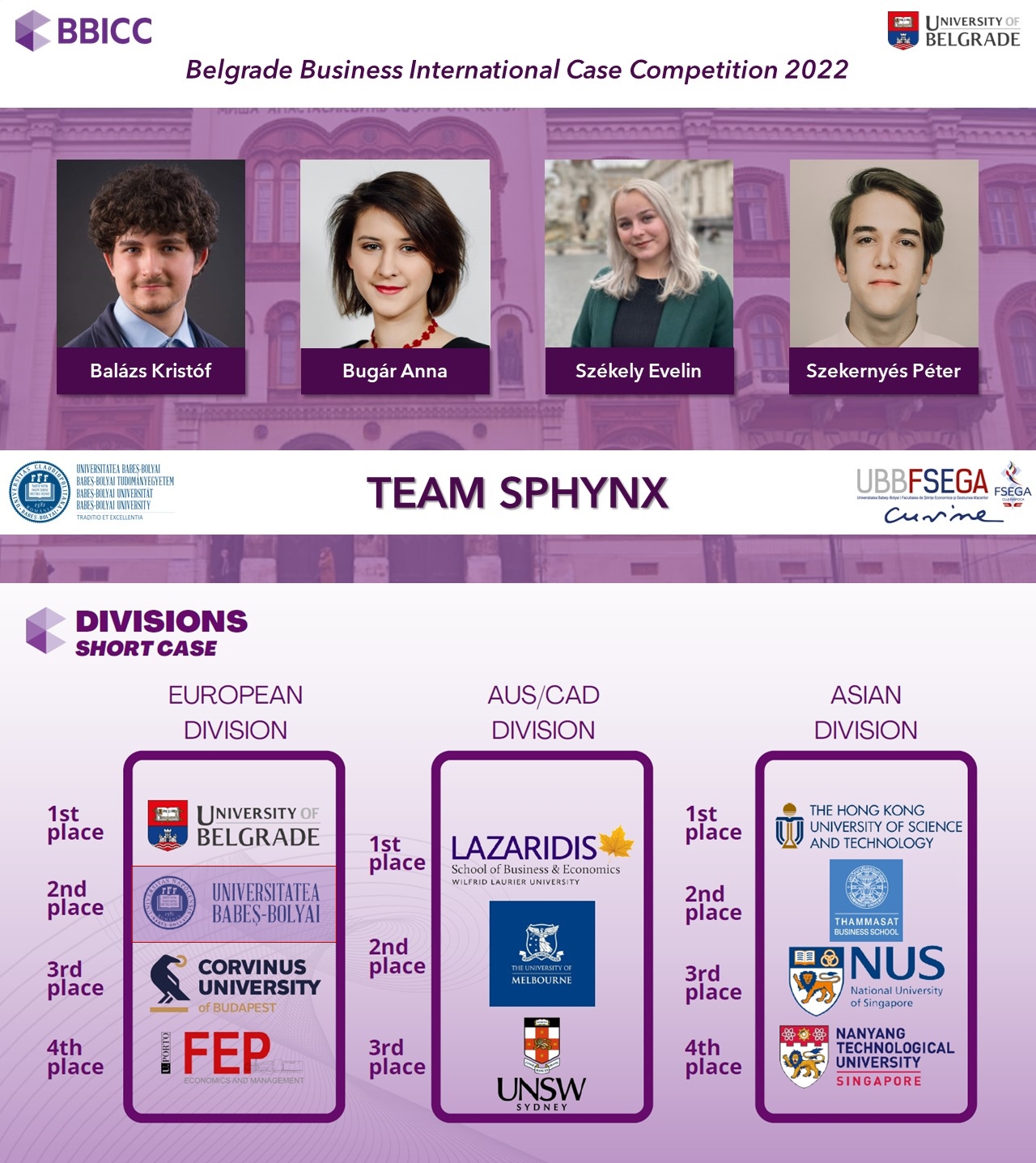 În perioada 8-13 mai 2022 a avut loc cea de-a opta ediție a competiției internaționale de studii de caz „Belgrade Business International Case Competition” (BBICC), organizată de Universitatea din Belgrad în mediul online. La această competiție a participat și o echipă formată din patru studenți ai Facultății de Științe Economice și Gestiunea Afacerilor din cadrul Universității Babeș-Bolyai, concurând cu universități prestigioase precum Universitatea Wilfrid Laurier - Lazaridis School of Business and Economics (Canada), The Hong Kong University of Science and Technology, National University of Singapore sau gazdele de la Universitatea din Belgrad.